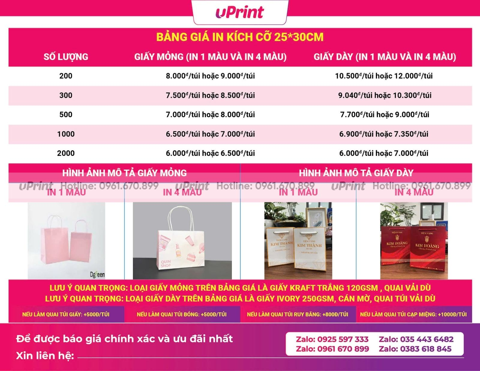 Bảng giá in túi giấy kích cỡ 25 x 30cm