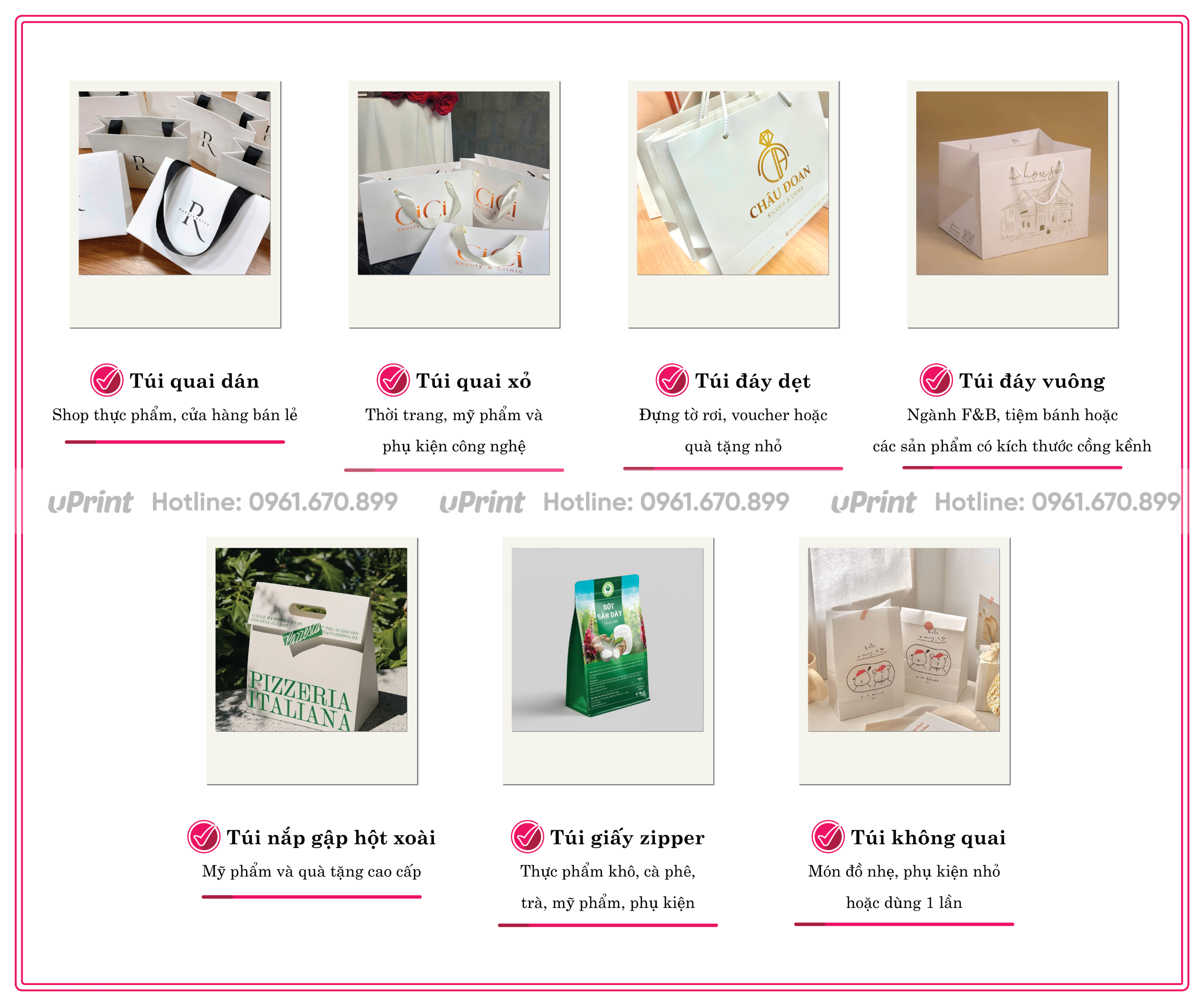 Dựa trên kinh nghiệm thực chiến từ hàng nghìn đơn hàng, uPrint giúp bạn tối ưu chi phí và bùng nổ thương hiệu với 07 kiểu dáng túi thịnh hành nhất:
