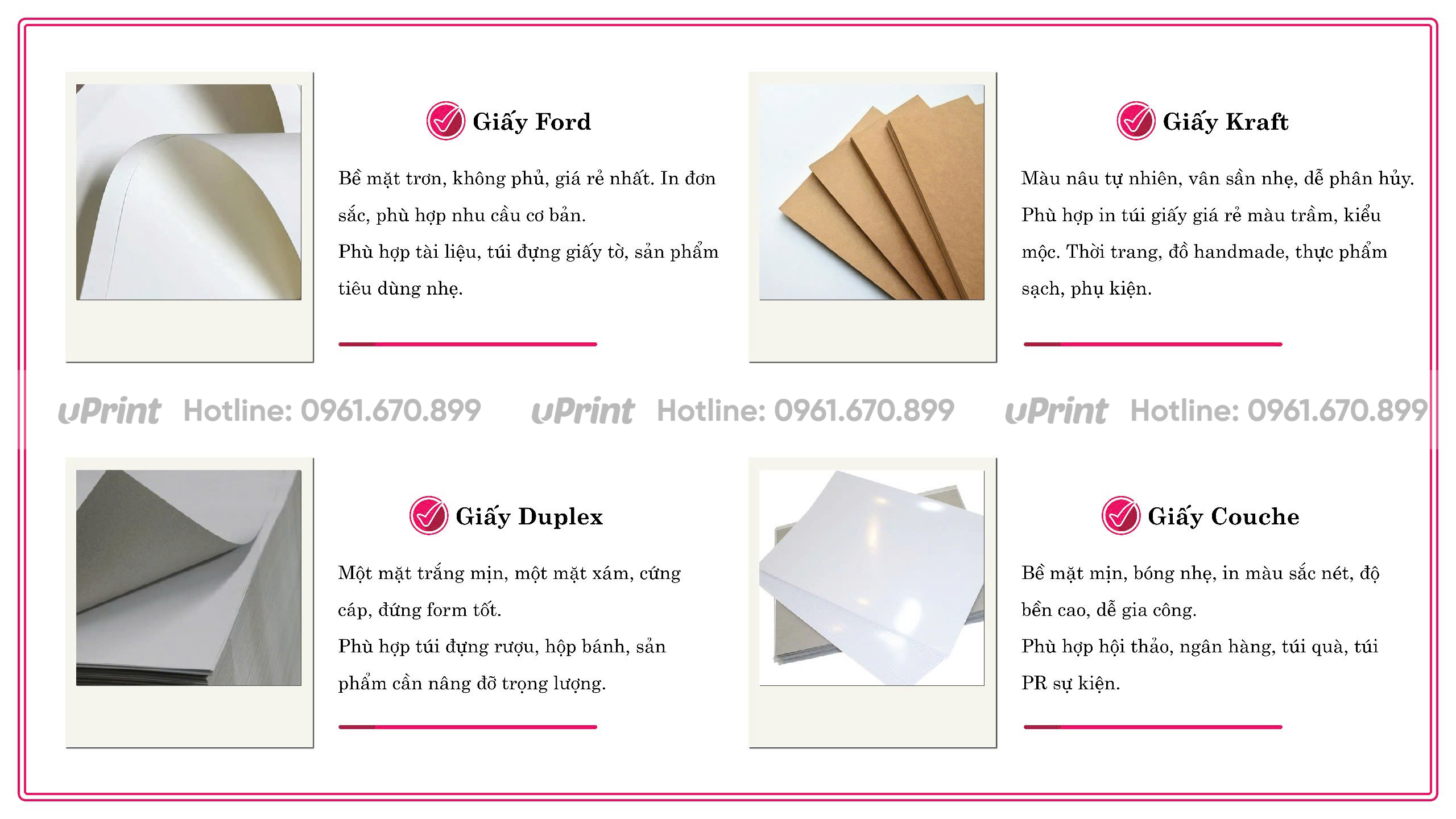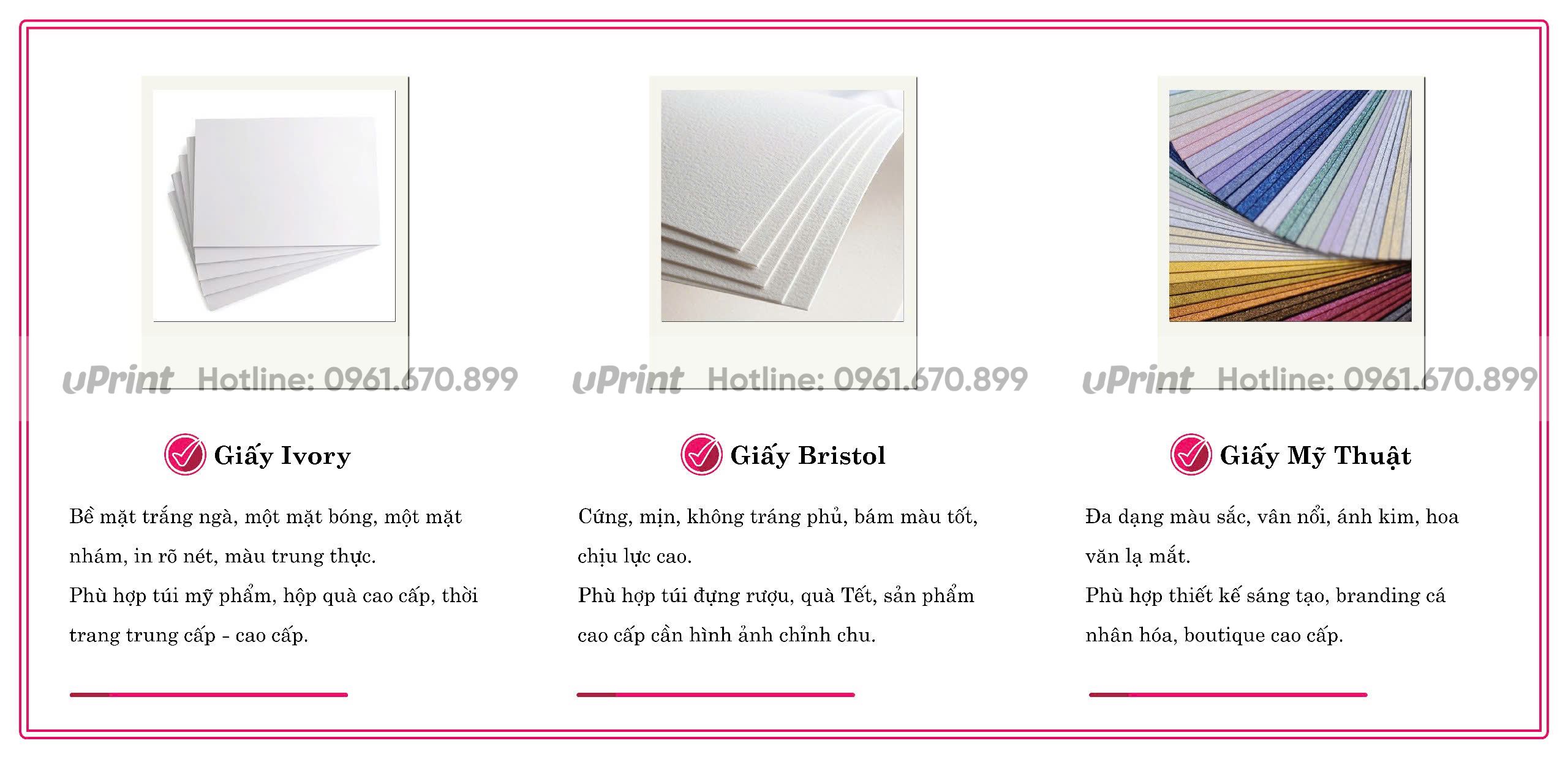 Giữa rất nhiều lựa chọn trên thị trường, uPrint định vị mình là xưởng in túi giấy theo yêu cầu, tập trung vào 3 yếu tố cốt lõi: